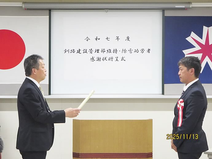 令和7年度 釧路建設管理部維持・除雪功労者感謝状贈呈式にて、当社職員が授与されました。