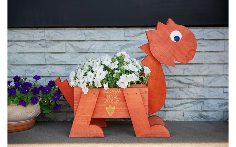 むかわ町穂別産の木材を使用した恐竜プランター