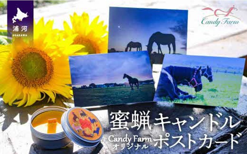 浦河町小笹養蜂園の天然蜜蝋100%使用した手作り「蜜蝋キャンドル」と、Candy Farmで暮らすかわいい馬たちの「ポストカード」をセットにしてお届けします!8,000円