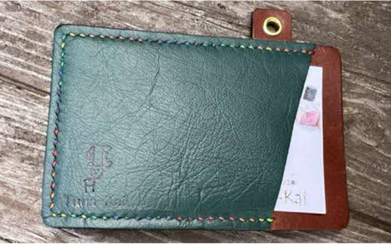 道産牛革を使った手作りのパスケース。カラフルな色の糸を一つずつ手縫いで縫っており、Tuna-Kaiのロゴとマークが刻印しています。交通機関のカードやタッチ決済のカードケースとしてもご利用いただけます。15,500円