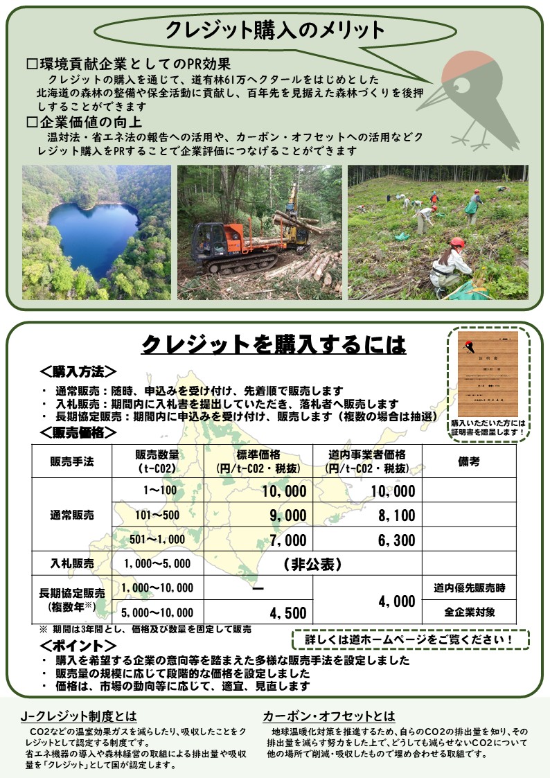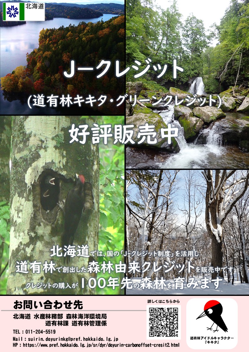 道では、国の「J-クレジット制度」を活用して、道有林におけるCO2吸収量をクレジット(道有林キキタ・グリーンクレジット)として販売しています。