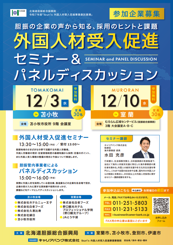 苫小牧市と室蘭市で「外国人材受入促進セミナー&パネルディスカッション」を実施します。