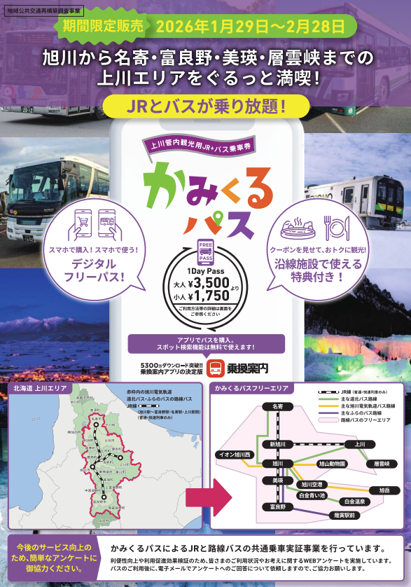 北海道上川地域公共交通活性化協議会では、JR富良野線連絡会議と共同して、スマートフォン専用アプリ「乗換案内」で現在も販売中の電子チケット「かみくるパス」に旭川駅~富良野駅・名寄駅・上川駅間のJRも乗り放題となる実証事業を期間限定で実施します。