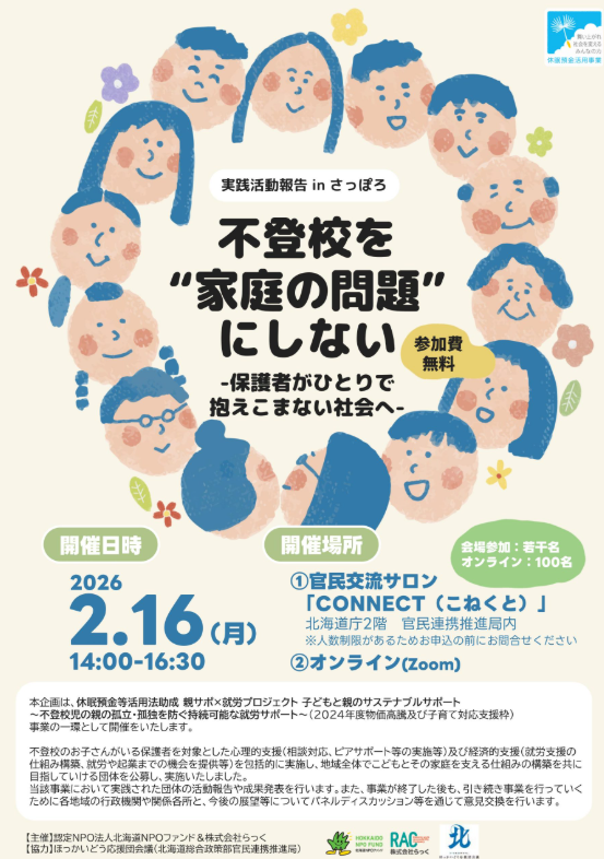 認定NPO法人北海道NPOファンド及び株式会社らっくは、2024年度休眠預金助成事業「親サポ×就労プロジェクト」実行団体による成果報告会を開催します。