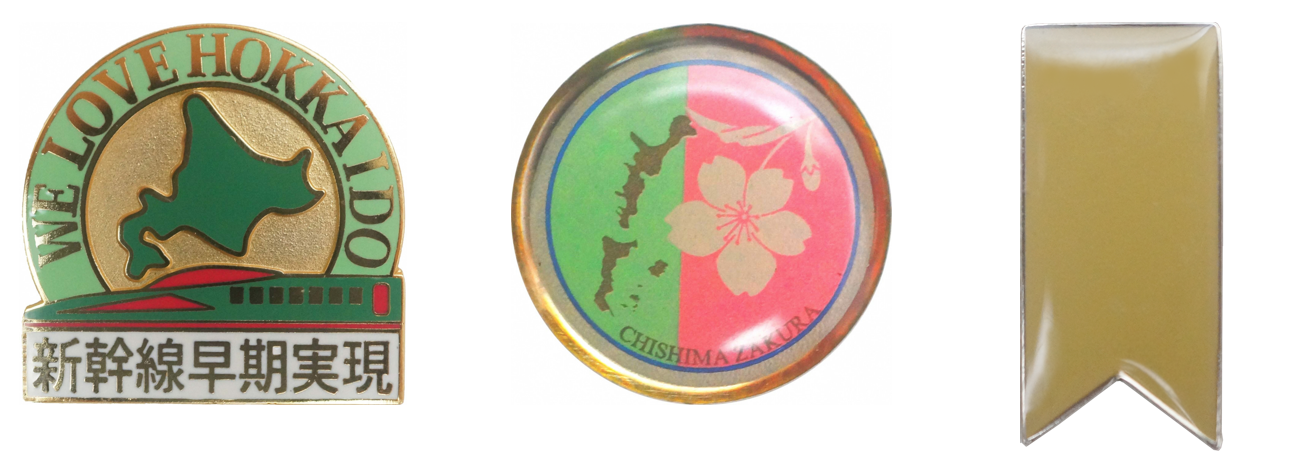 北海道倶楽部では、早期実現「新幹線」バッジ、北方領土返還運動推進として「ブラウンリボン」「千島桜」を頒布しています。