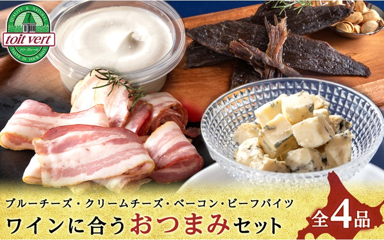 ワインに合うおつまみクリームチーズ、ベーコンスライス、ブルーキューブ、ビーフバイツの4種のセットです。ワインと一緒に是非ご賞味くださいませ。8,000円