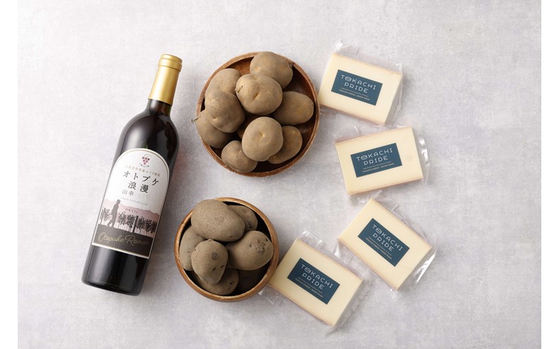オトプケ浪漫山幸2023は、色合いは黒がかった濃い赤で糖度が高く酸味とのバランスが絶妙なワインです。モール温泉水を用いた独自の熟成方法で作られたラクレットチーズや2種類のじゃがいもとお楽しみください。32,000円