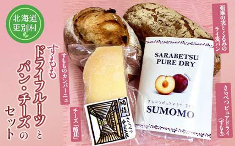 パン舎こだわり、無添加のすももドライフルーツ、すもものカンパーニュ・亜麻の実とくるみのライ麦パンと、さらべつチーズ工房のチーズ「酪佳」のセットです。17,000円