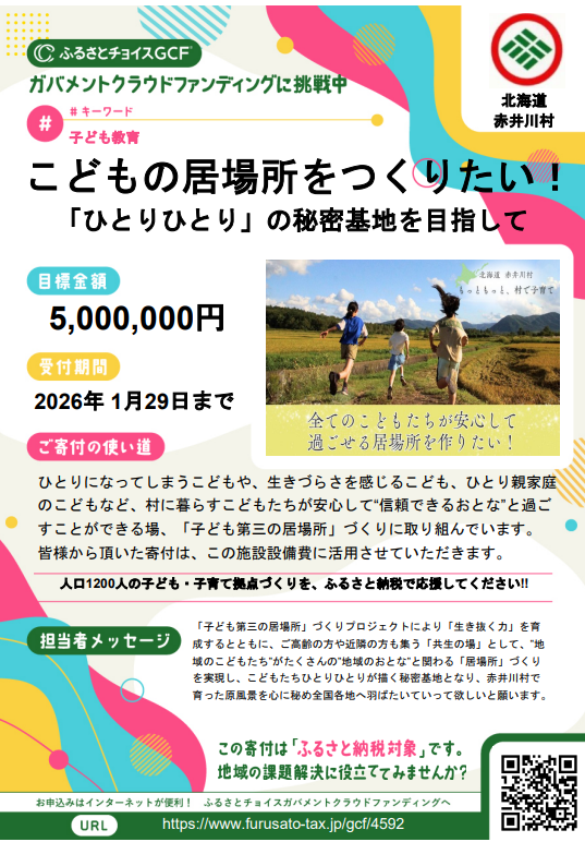 この「子ども第三の居場所」づくりプロジェクトにより「生き抜く力」を育成するとともに、ご高齢の方や近隣の方も集う「共生の場」として、”地域のこどもたち”がたくさんの”地域のおとな”と関わる「居場所」づくりを実現し、こどもたちひとりひとりが描く秘密基地となり、赤井川村で育った原風景を心に秘め全国各地へ羽ばたいていって欲しいと願います。