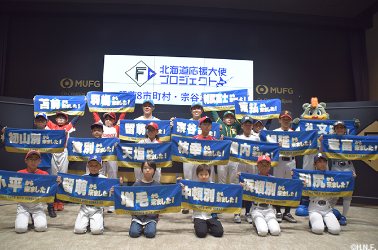 11月9日(日)にエスコンフィールドHOKKAIDOにて、北海道佐呂間町出身の玉井大翔投手と北海道札幌市出身の今川優馬選手、対象エリアの小学生が参加し、対象エリア発表セレモニーを実施しました。