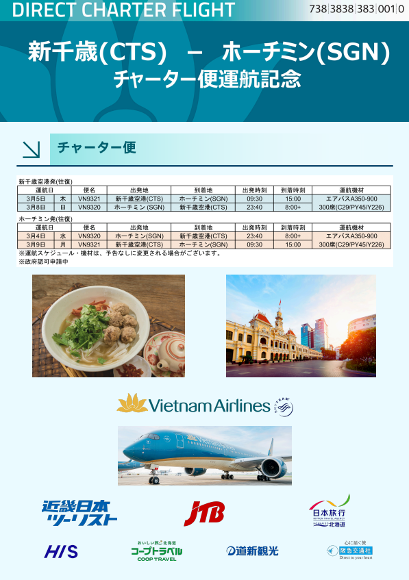 ベトナム航空では、北海道、ベトナム航空、北海道エアポート株式会社との連携・協力に関する覚書に基づき、北海道とベトナムを結ぶ国際定期航空路線の開設を目指し、2026年3月5日(木)と3月8日(日)の2日間、「新千歳=ホーチミン間」で直行チャーター便を運航します。