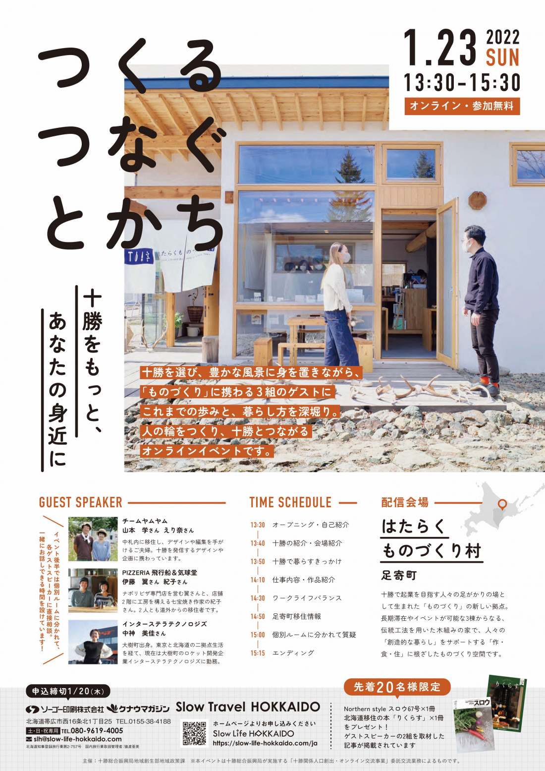 本セミナーでは、足寄町の滞在・イベント施設「はたらくものづくり村」から生配信。「ものづくり」に携わる30代~40代のゲストを招き、これまでの歩みや仕事と家庭のあり方などを深掘りしていきます。