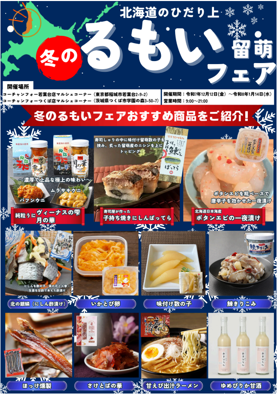 コーチャンフォー若葉台店及びつくば店の2店舗において、「北海道のひだり上 るもいフェア」を開催し、管内の魅力ある特産品のPRを実施します。