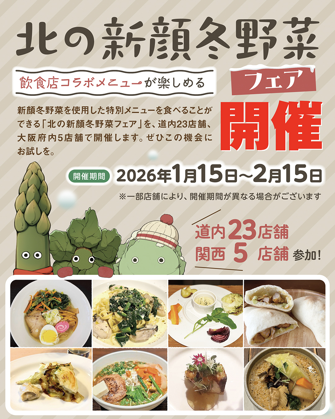新顔冬野菜(ちぢみほうれんそう、伏せ込みアスパラガス、雪の下キャベツなど)を使った特別メニューを提供する「北の新顔冬野菜フェア」を、道内と関西の飲食店で開催しますので、是非、ご賞味ください!