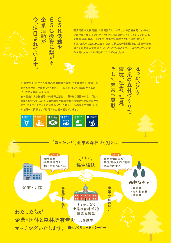 北海道では、森を育てる取組を希望している企業・団体の皆様と、道内に森林を有する森林所有者(市町村・法人や個人・北海道)とのマッチングを行っています。