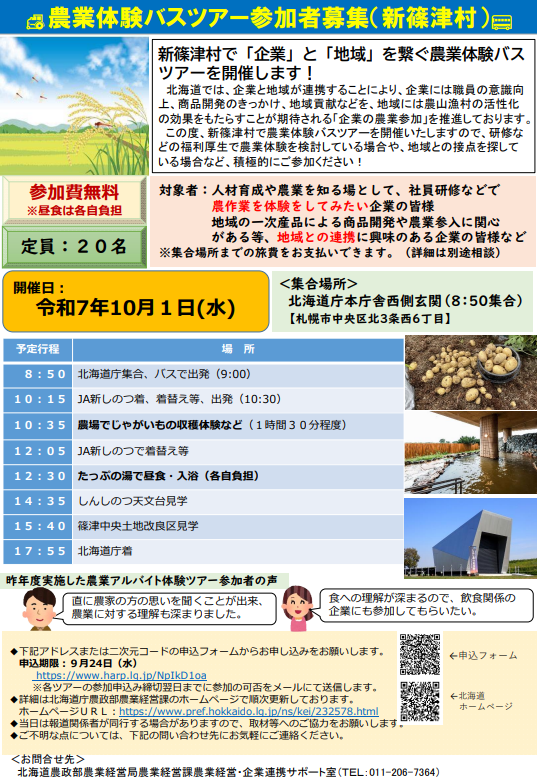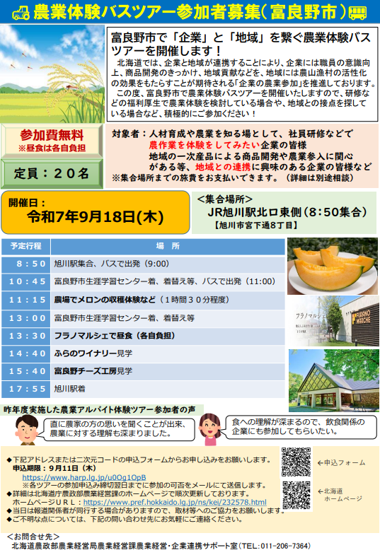 この度、研修などの福利厚生で農業体験を検討している企業や、地域との接点を探している企業などを対象に、富良野市、新篠津村及び帯広市で農業体験バスツアーを開催します。