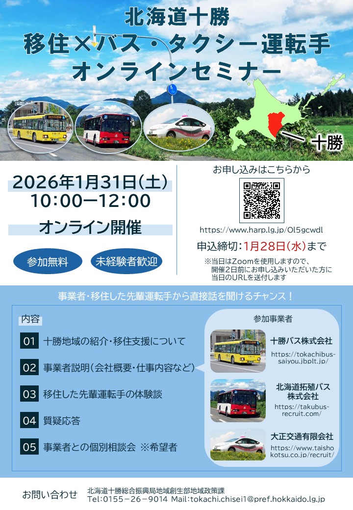 「北海道十勝 移住×バス・タクシー運転手オンラインセミナー」を開催します!
