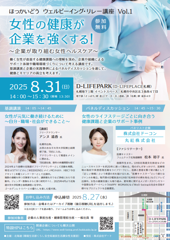 道では、女性がライフステージに応じて健康で働き続けられる環境づくりを推進するため、働く女性が直面する健康課題への理解を深め、企業や組織によるサポート体制や職場環境づくりについて考えるリレー講座(全2回)を開催します。